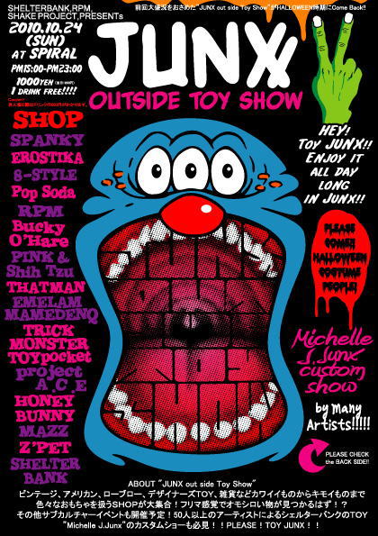 | ABOUT "JUNX out side Toy Show"(ジャンクス アウトサイド トイ ショーについて) ビンテージ、アメリカン、ローブロー、デザイナーズTOY、雑貨などカワイイものからキモイものまで 色々なおもちゃを扱うSHOPが大集合!フリマ感覚でオモシロい物が見つかるはず!? その他サブカルチャーイベントも開催予定!50人以上のアーティストによるシェルターバンクのTOY ”Michelle J.Junx”のカスタムショーも必見!!PLEASE!TOY JUNX!! |